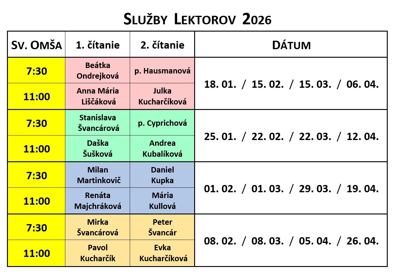 Pane, oživuj v našej farnosti dary Tvojej milosti: Potrebujeme ľudí, ktorí vedia počúvať. Ľudí tvoriacich pokoj, ľudí, ktorí potrebujú spoločenstvo a jednotu, ktorí upokojujú a zmierujú, sú príkladom a hovoria pravdu bez toho, že by zraňovali. Potrebuje ľudí, z ktorých vyžaruje Tvoj Duch a vzbudzujú nádej, zasadzujú sa nezištne za službu Tebe a Tvojmu kráľovstvu. Pane, daruj nám ľudí schopných presvedčiť druhých, ľudí, ktorí sa modlia a premieňajú modlitbu na činy. Pane, daj, aby sa naša farnosť stávala misijným spoločenstvom, spôsobilým pomáhať Ti v službe pre spásu sveta. Amen.